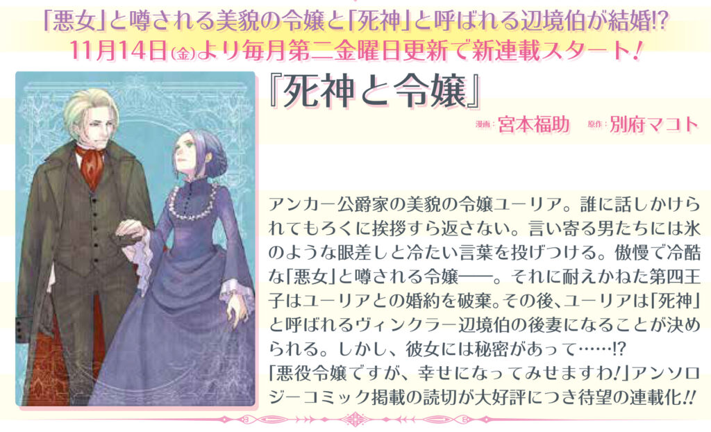 ゼロサム本誌・Xでも情報が出てますが、今月14日より別府マコト原作・宮本福助さんの漫画で「死神と令嬢」の連載がスタートしますよ。